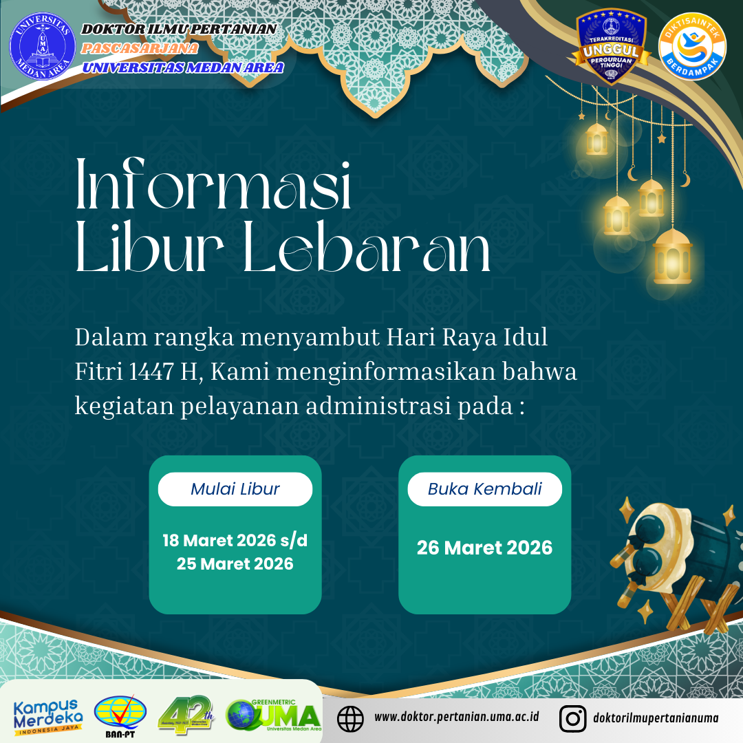 Dalam rangka menyambut Hari Raya Idul Fitri 1447 Hijriah, Program Studi Doktor Ilmu Pertanian Pascasarjana Universitas Medan Area menginformasikan kepada seluruh mahasiswa, dosen, serta civitas akademika bahwa kegiatan pelayanan administrasi akan diliburkan sementara.
