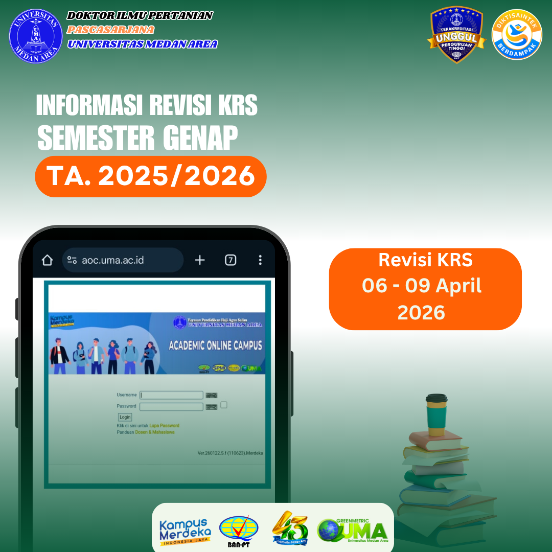 Program Studi Doktor Ilmu Pertanian Pascasarjana Universitas Medan Area menginformasikan kepada seluruh mahasiswa bahwa periode revisi Kartu Rencana Studi (KRS) Semester Genap Tahun Akademik 2025/2026 akan dilaksanakan pada: