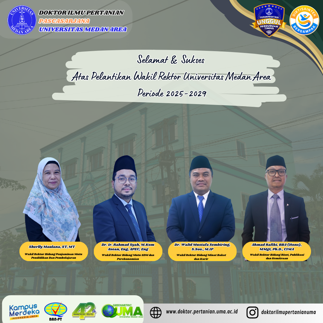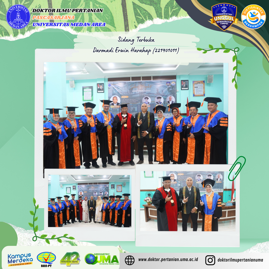 Sidang Terbuka Promosi Doktor – Program Studi Doktor Ilmu Pertanian an. Darmadi Erwin Harahap Posted on October 30, 2025October 30, 2025 by Doktor Ilmu Pertanian 0 Medan, 30 Oktober 2025 – Pascasarjana Universitas Medan Area kembali melaksanakan Sidang TerbukaContinue Reading