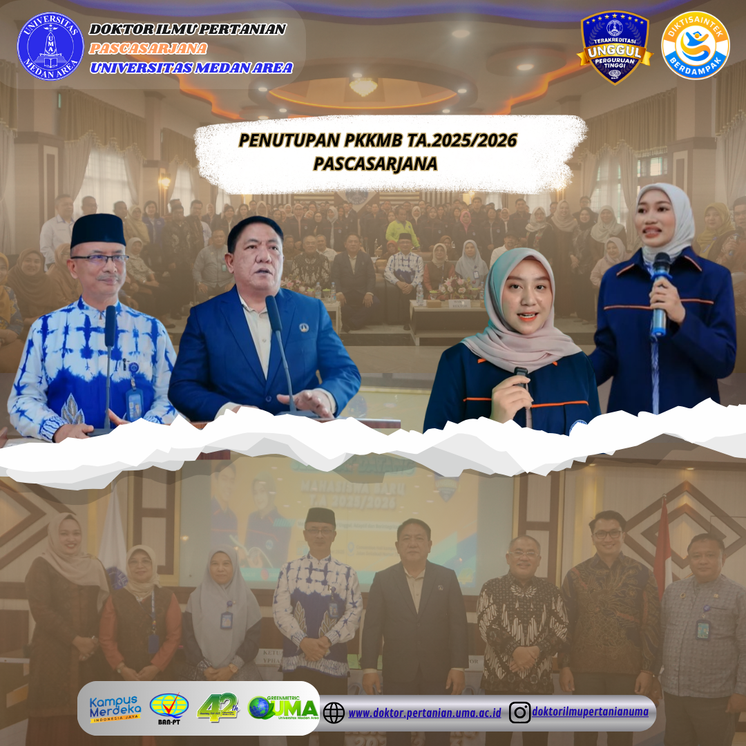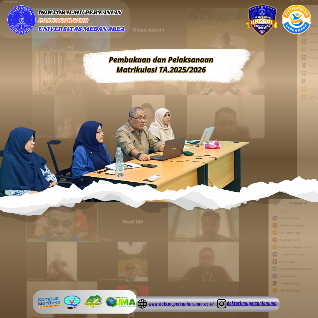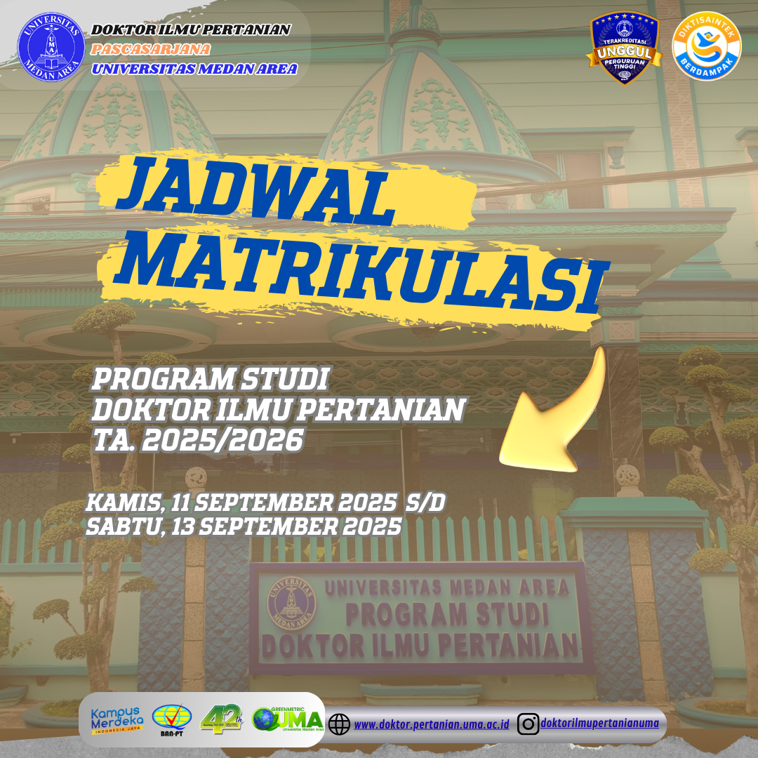 Pembukaan dan Kegiatan Matrikulasi Program Studi Doktor Ilmu Pertanian UMA Angkatan 2025/2026 Posted on September 11, 2025September 19, 2025 by Doktor Ilmu Pertanian 0 Medan, 11 September 2025 – Program Studi Doktor (S3) Ilmu Pertanian Universitas Medan Area (UMA) mContinue Reading