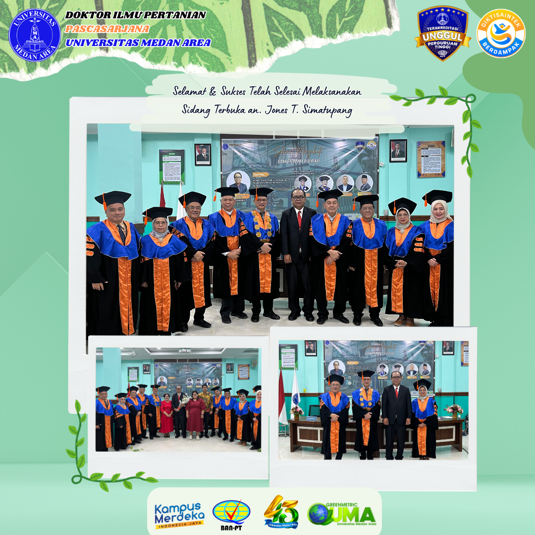 Sidang Terbuka Promosi Doktor Mahasiswa Program Studi Doktor Ilmu Pertanian an. Jones T Simatupang Posted on March 12, 2026March 16, 2026 by Doktor Ilmu Pertanian 0 Program Studi Doktor Ilmu Pertanian Pascasarjana Universitas Medan Area kembali melaksanakan Sidang Continue Reading